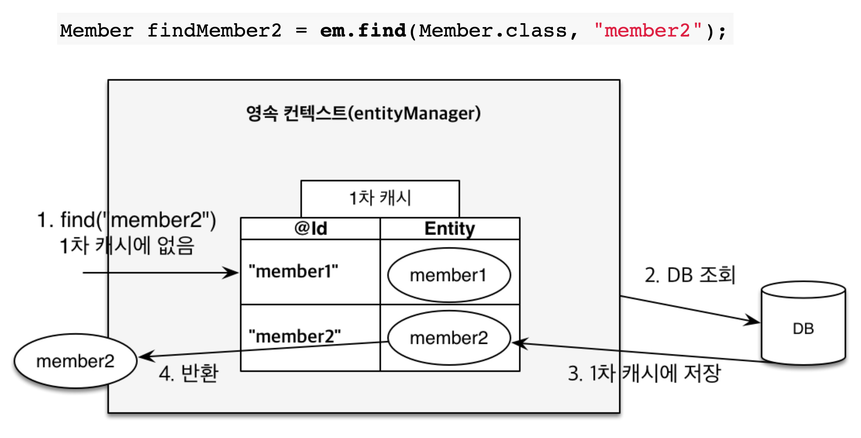 - find() : 영속성 컨텍스트에서 엔티티르 검색하고 없을 경우 데이터베이스에서 데이터를 찾아 영속성 컨텍스트에 저장