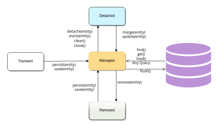 - 영속(managed) : 엔티티가 영속성 컨텍스트에서 저장된 상태로 영속성 컨텍스트와 관련이 없는 상태