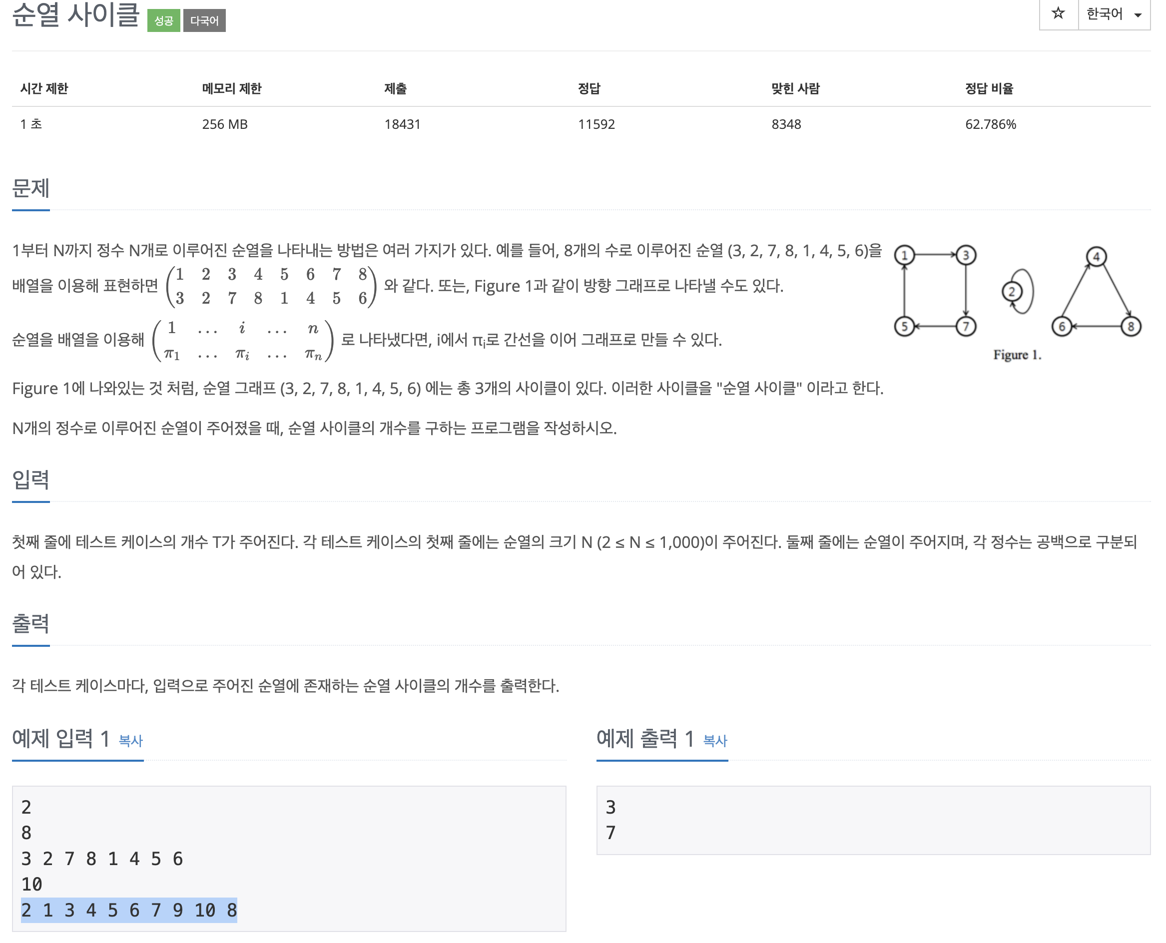 뒤 아래 순열을 비교하고 두 배열의 i번째 인덱스 값이 같으면 하나의 사이클로