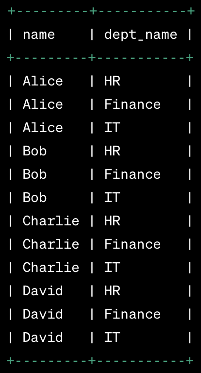 - 두 테이블 간 가능한 모든 조합을 반환한다.