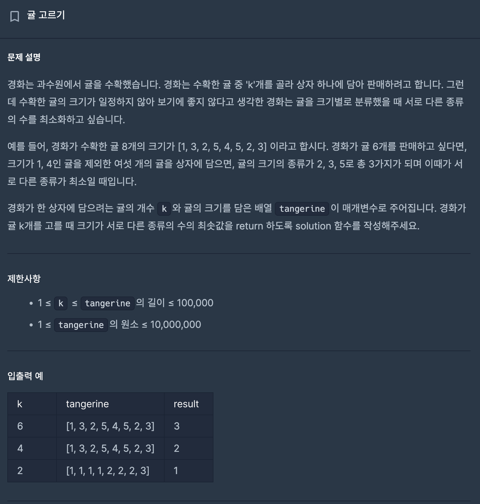 👨💻 아무생각없이 문제를 읽고 리스트에 담아서.. 크기별로 개수를 맵에 담은 다음에.. 그 개수를 다시 리스트에 담아서.. 정렬하고.. 역으로 돌린 다음에 순차적으로 더했을 때 k보다 같거나 크면 끝내 보자!!라는 생각을 하고 바로 코드를 짜보았다. 너무 길어지고 효율성도 너무 똥일 것같았지만 일단 해보았다. 레벨 2부터는 효율성도 따지길래 틀렸을 거라고 생각했는데 성공은 했다 ㅋㅋ