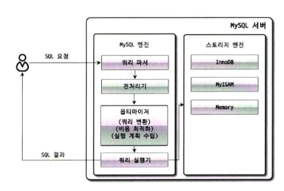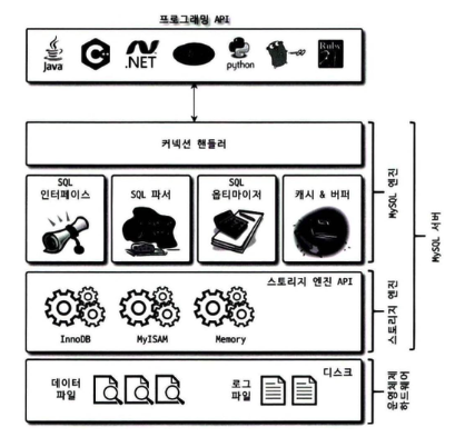 클라이언트로부터 접속 및 쿼리 요청을 처리하는 커넥션 핸들러와 SQL 파서 및 전처리기, 쿼리의 최적화된 실행을 위한 옵티마이저가 중심을 이룬다.