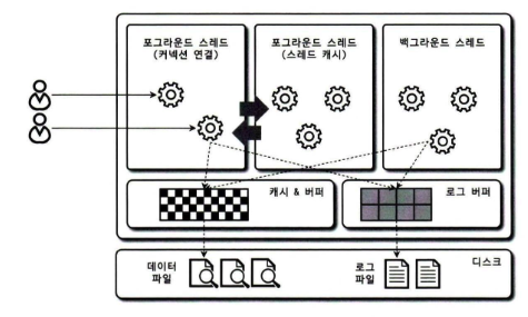 모두 중요하지만 가장 중요한 것은 로그 스레드와 버퍼의 데이터를 디스크로 내려쓰는 작업을 처리하는 쓰기 스레드일 것이다. InnoDB가 백그라운드에서 작업을 처리하는 이유 InnoDB가 이러한 작업들을 백그라운드에서 처리하는 가장 큰 이유는 쿼리 처리 성능 향상을 위해서다. 만약 사용자 쿼리를 처리하는 포그라운드 스레드가 디스크 I/O까지 직접 처리한다면, 디스크의 느린 쓰기 속도 때문에 사용자는 쿼리 결과를 받기까지 오래 기다려야 한다.