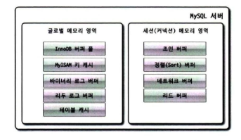 MySQL에서 사용되는 메모리 공간은 크게 글로벌 메모리 영역과 로컬 메모리 영역으로 구분할 수 있다. 글로벌 메모리 영역의 모든 메모리 공간은 MySQL 서버가 시작되면서 운영체제로부터 할당된다.