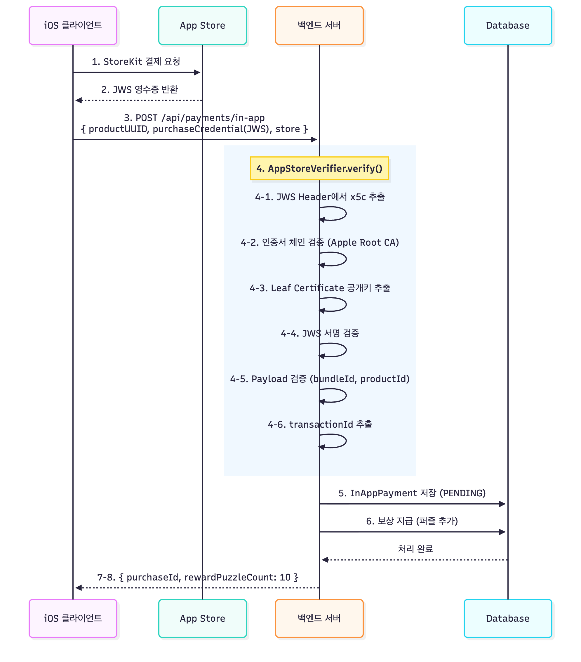 클라이언트가 JWS 형태의 영수증을 전달하면, 서버에서 Apple 공개키로 직접 서명을 검증합니다.